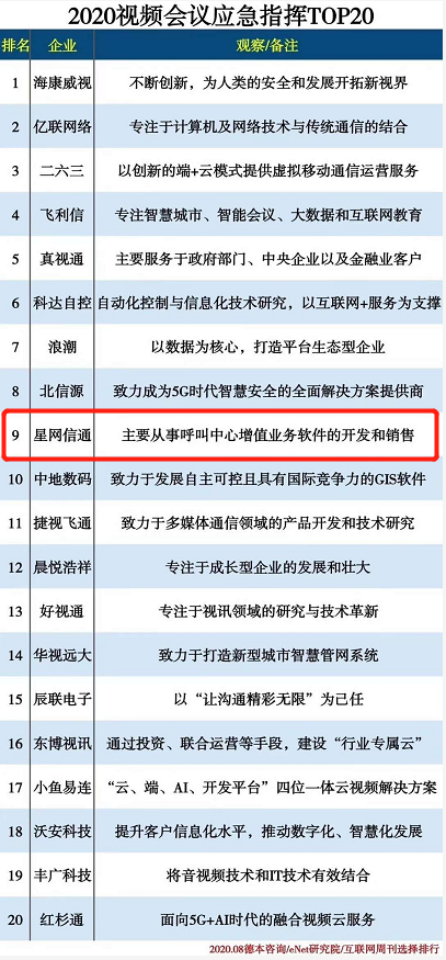• 行業(yè)的認(rèn)可——星網(wǎng)信通榮登2020視頻會議應(yīng)急指揮TOP20榜