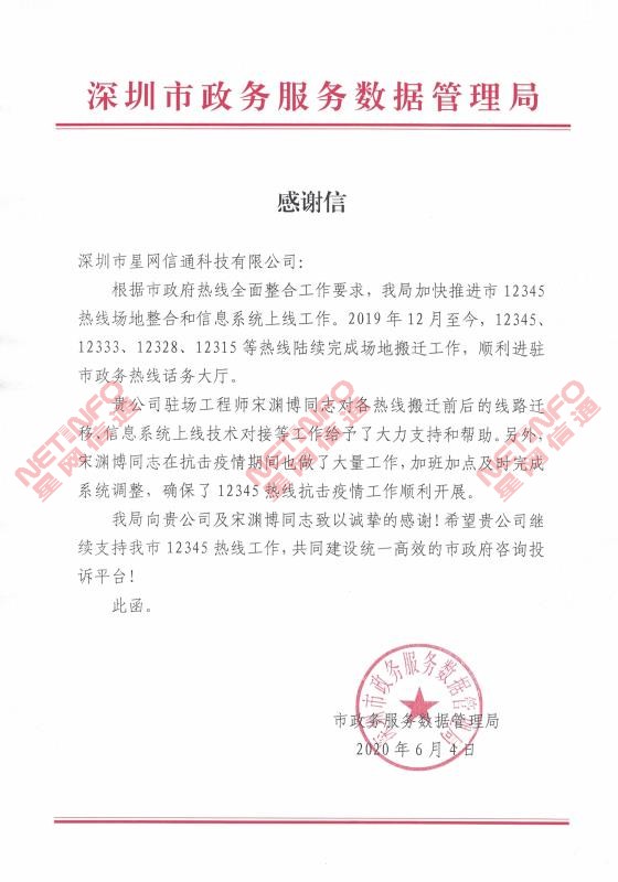 我司2019年承接的深圳市政府--12345熱線項目,在項目過程中,我司駐場工程師體現了極強的專業素養,克服了種種困難,圓滿提前完成了任務,獲得了客戶極高的評價和認可。客戶的滿意是星網信通存在的最大價值,我們感謝深圳市政府對我們的認可與信任,這無疑是對我們最大
