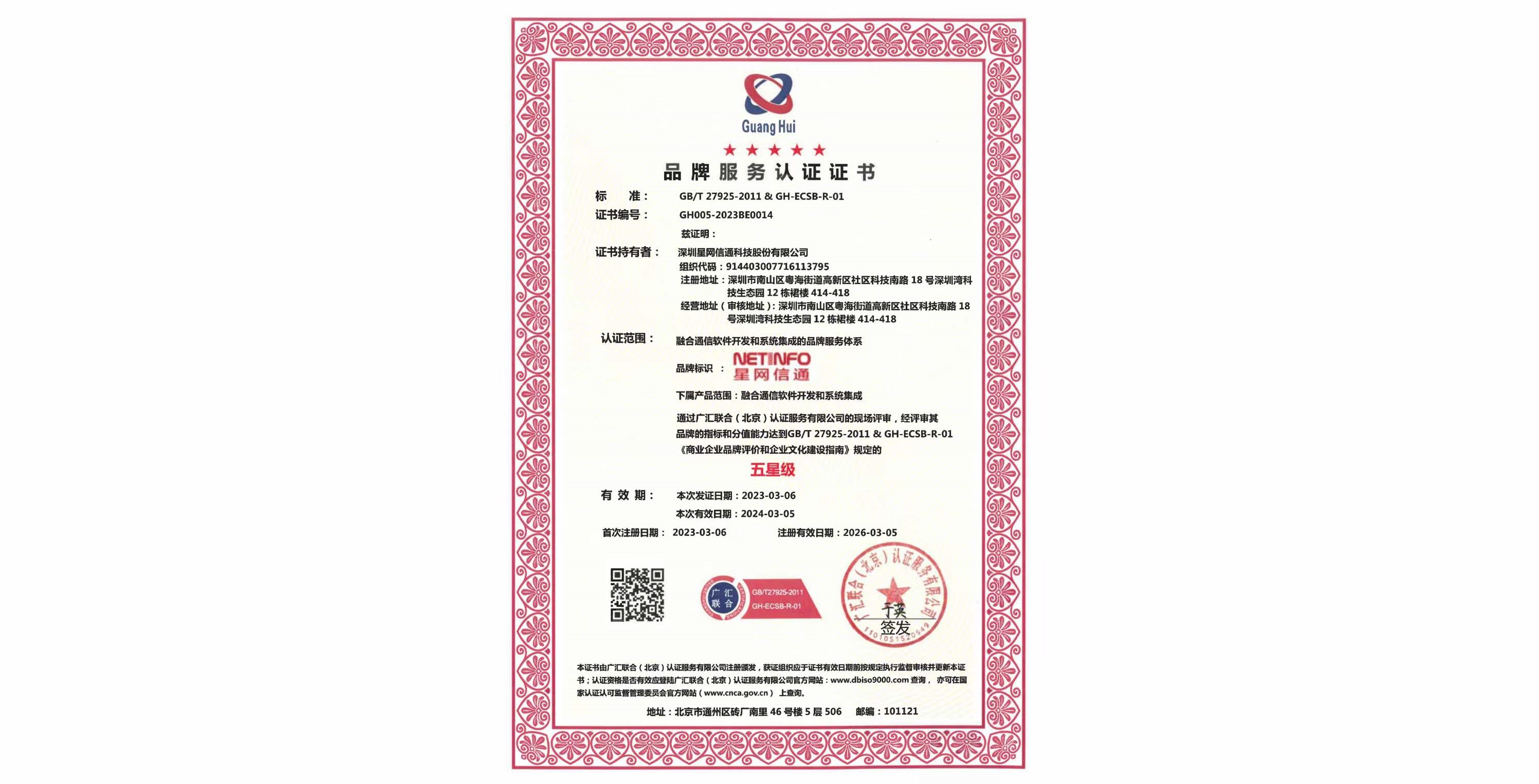我們非常自豪地宣布,近日,星網(wǎng)信通獲得了“五星級品牌服務(wù)認(rèn)證”,這是我們不斷努力和追求卓越的成果。 ? ? ? ?品牌認(rèn)證證書是對我們品牌價值和經(jīng)營理念的肯定,證明了我們的產(chǎn)品和服務(wù)在
