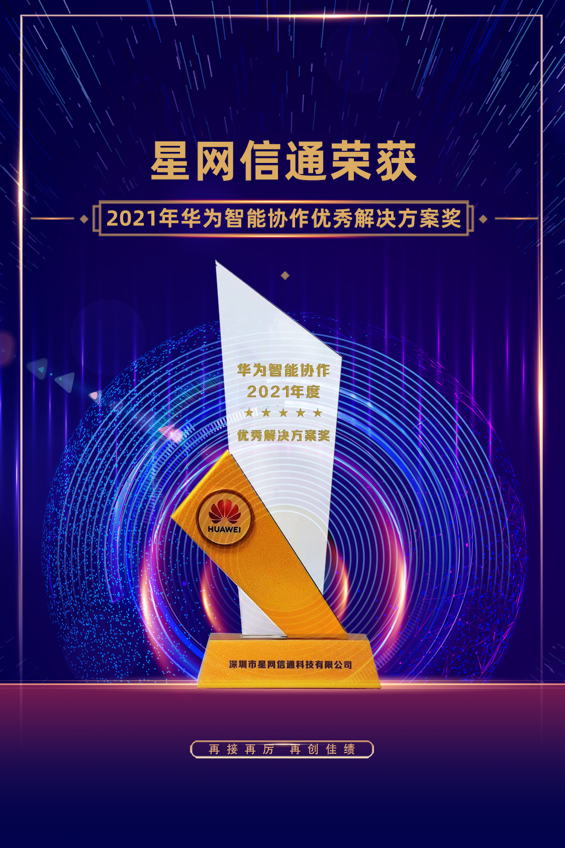 2021年,星網(wǎng)信通依托自身在音視頻行業(yè)的積累、依靠著雄厚的專業(yè)技術(shù)能力、高品質(zhì)的技術(shù)服務(wù)榮獲了2021年華為智能協(xié)作優(yōu)秀解決方案獎(jiǎng)。