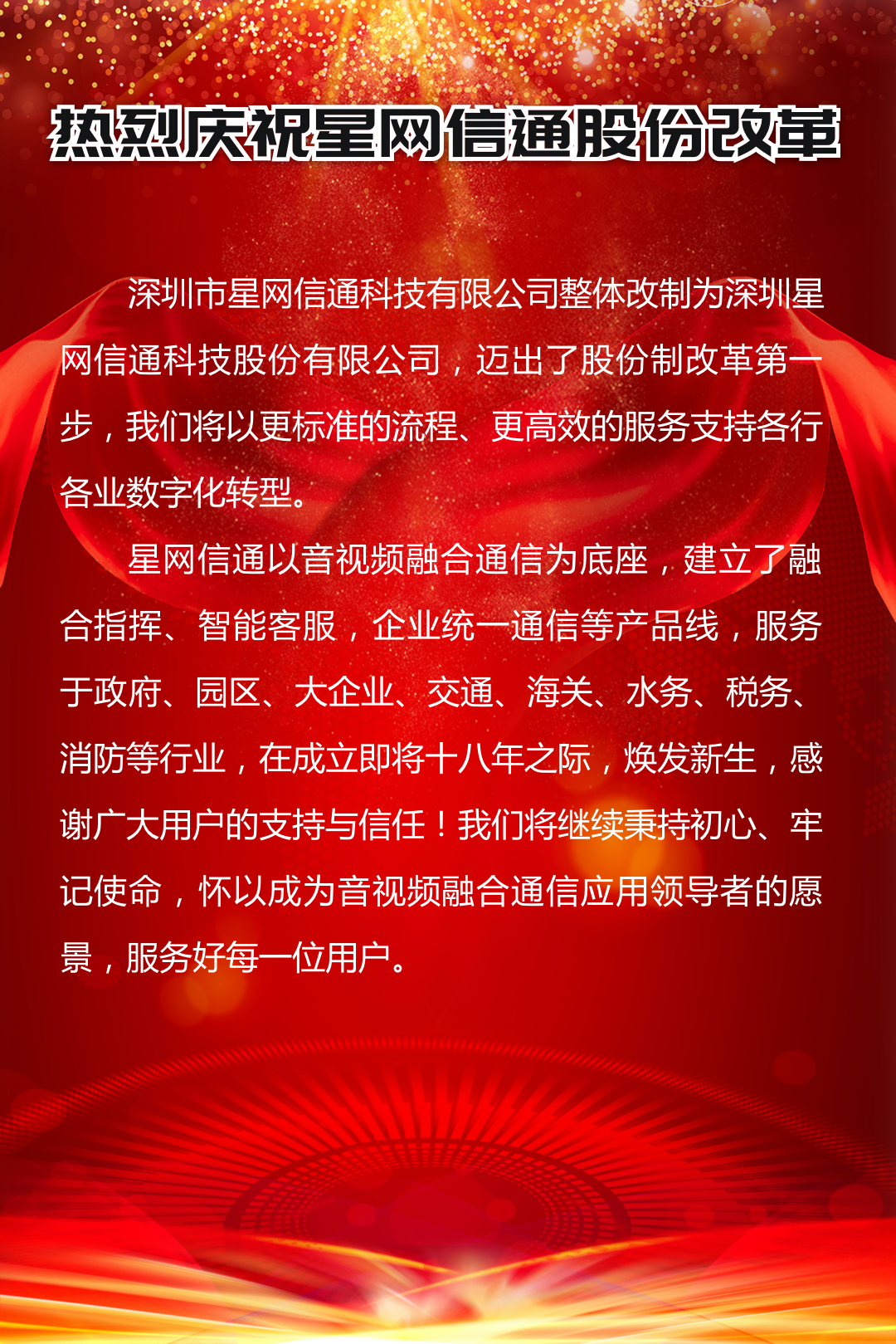 深圳市星網信通科技有限公司整體改制為深圳星網信通科技股份有限公司,邁出了股份制改革第一步,我們將以更標準的流程、更高效的服務支持各行各業數字化轉型。