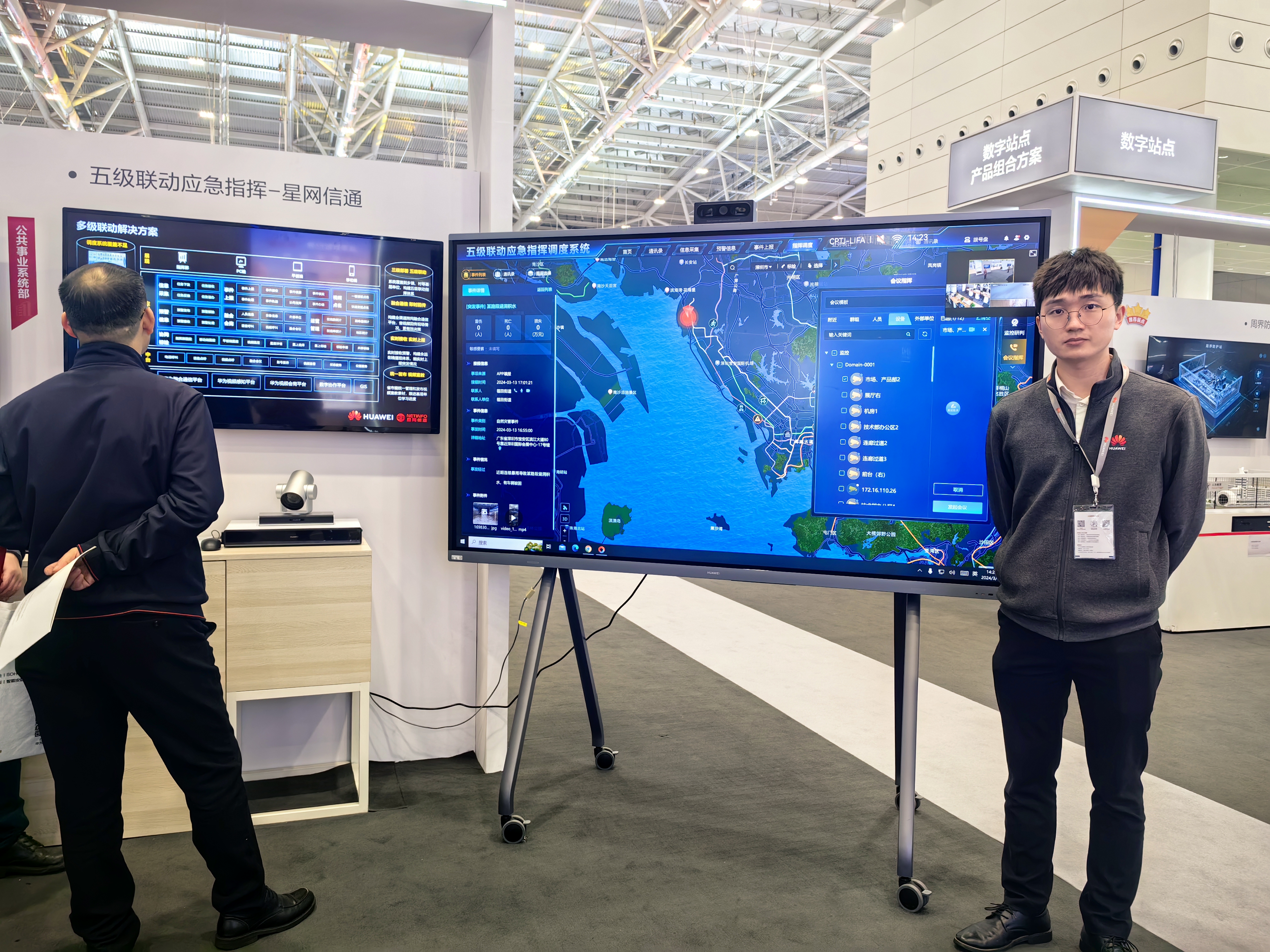 同時,星網信通受邀在合作伙伴大會上布展,主要展出了VDCP可視指揮系統和五級聯動應急指揮系統2個展臺,為參觀伙伴們宣講和展示了數智化指揮中心方案。