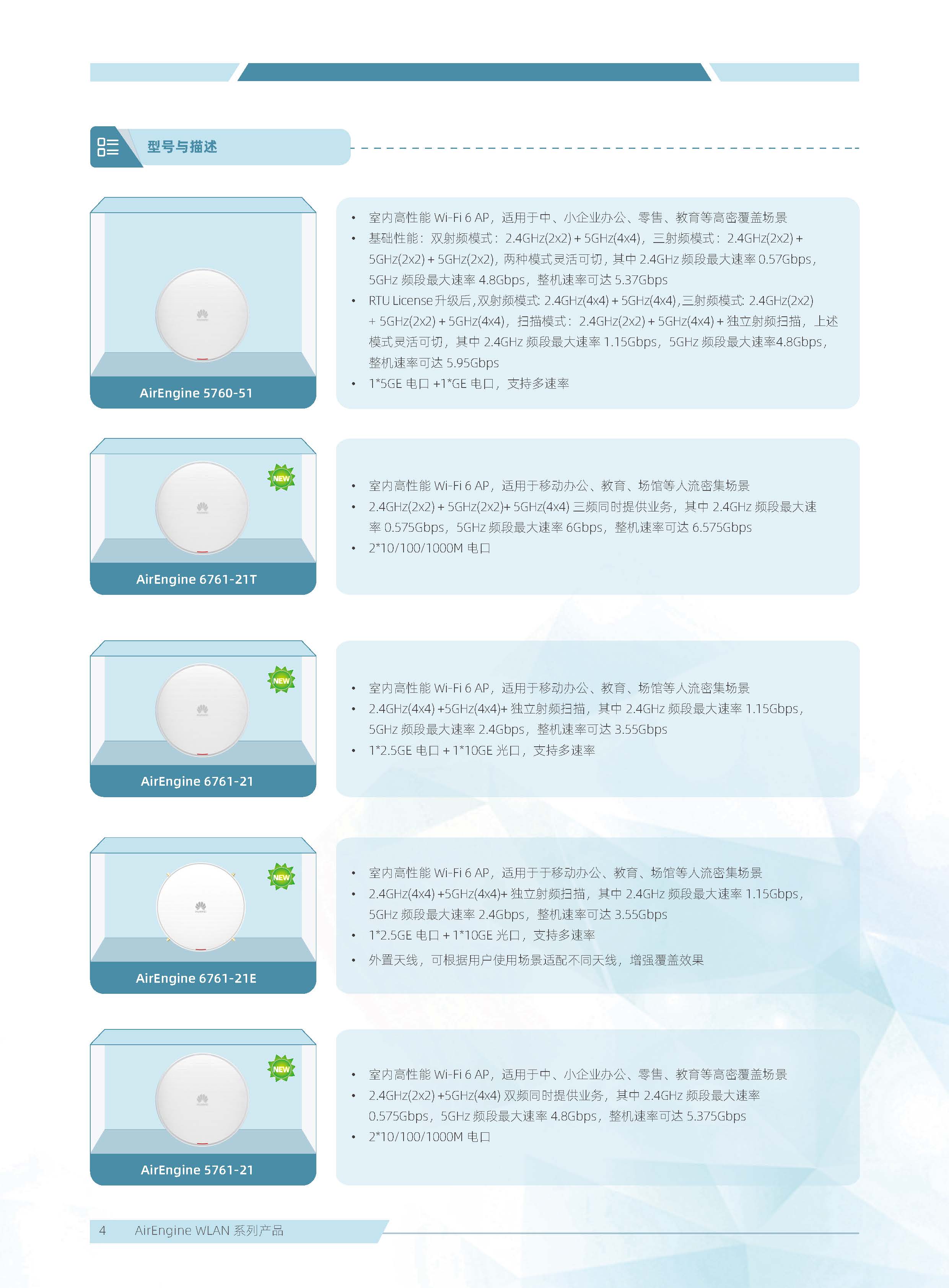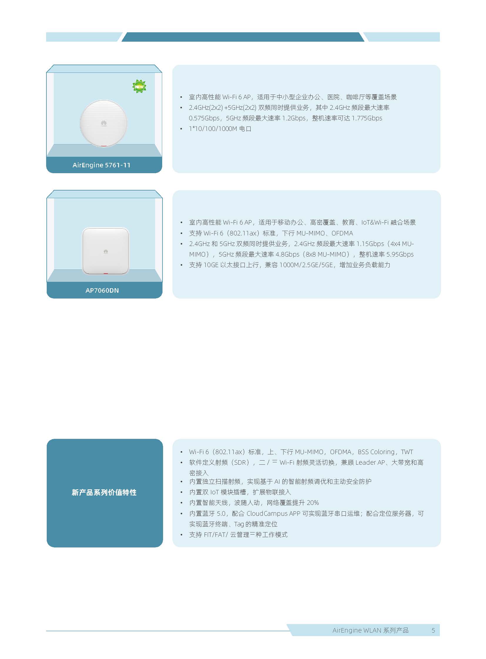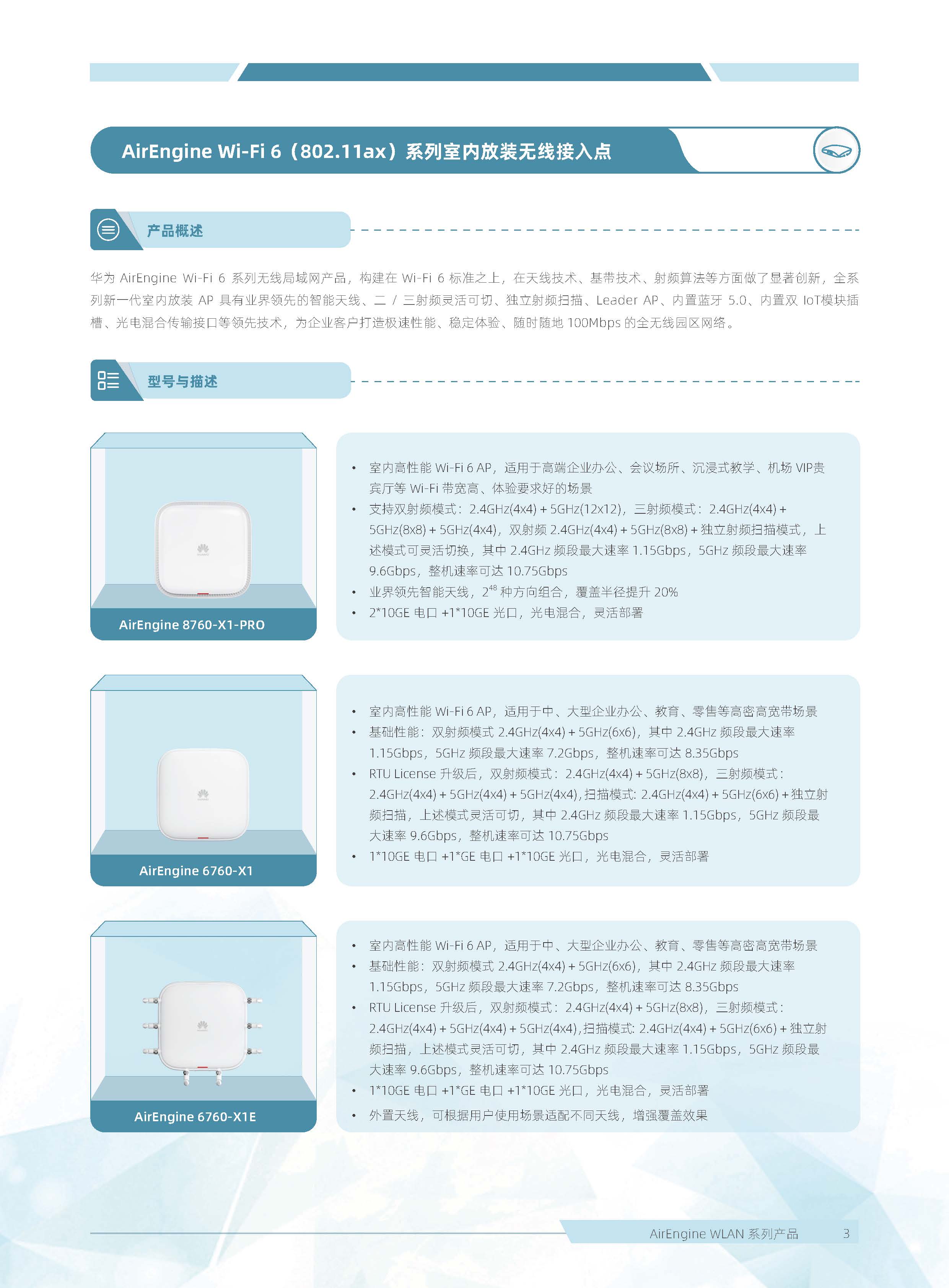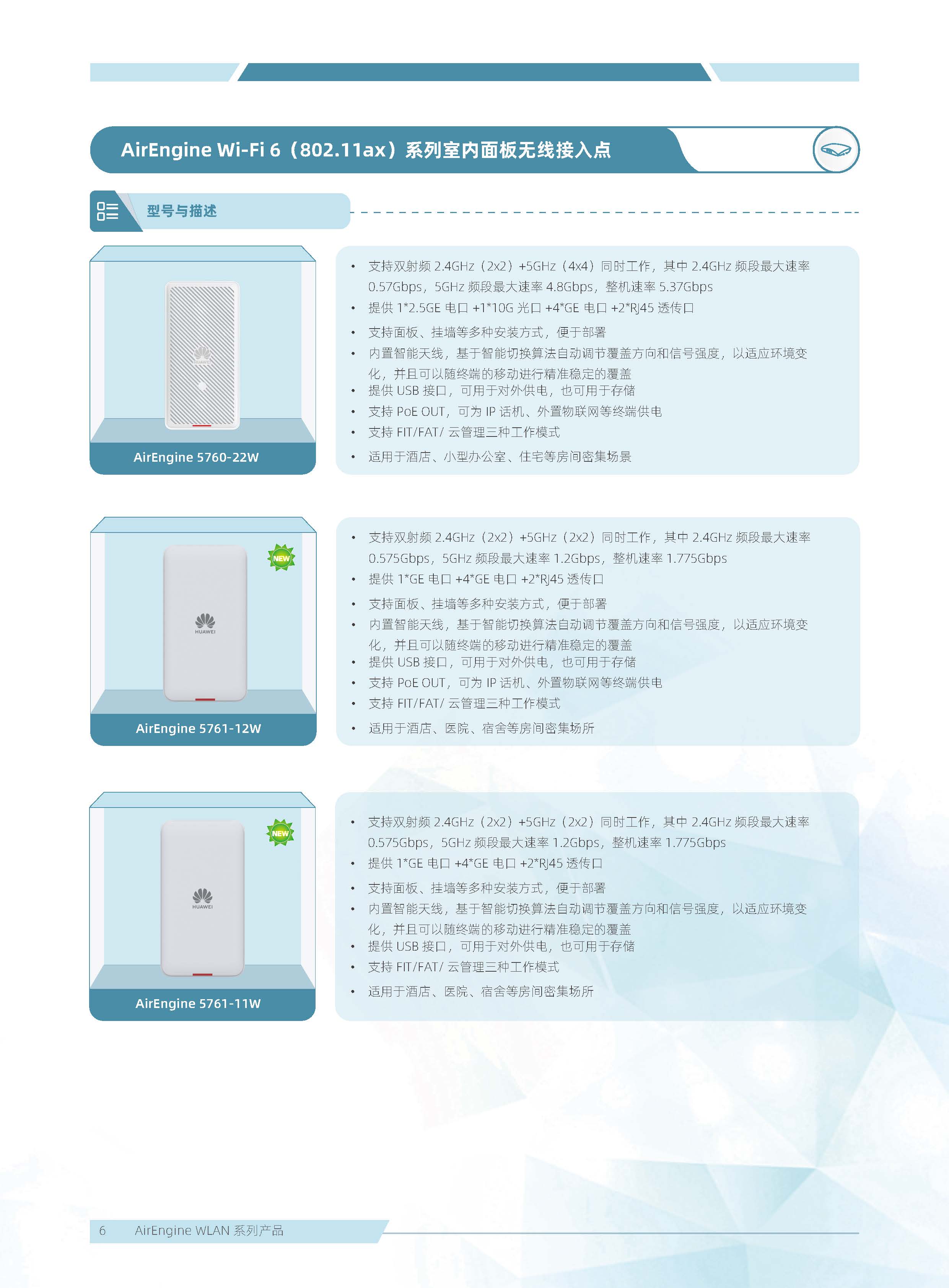 華為 AirEngine Wi-Fi 6 系列無線局域網產品,構建在 Wi-Fi 6 標準之上,在天線技術、基帶技術、射頻算法等方面做了顯著創新,全系列新一代室內放裝 AP 具有業界領先的智能天線、二 / 三射頻靈活可切、獨立射頻掃描、內置藍牙 5.0,內置雙 IoT 模塊卡槽、光電混合傳輸接口等領先技術,為企業客戶打造極速性能、穩定體驗、隨時隨地 100Mbps 的全無線園區網絡