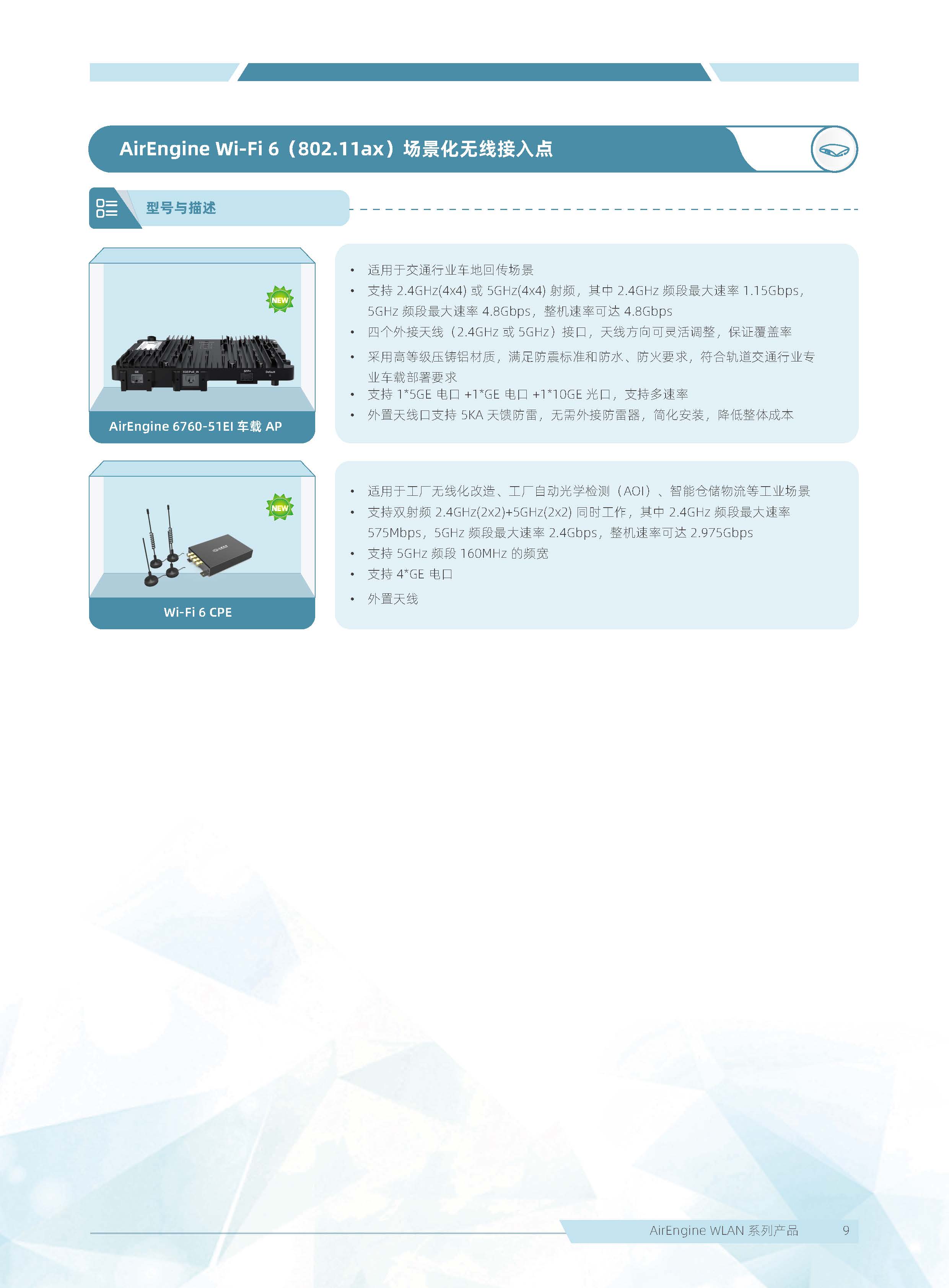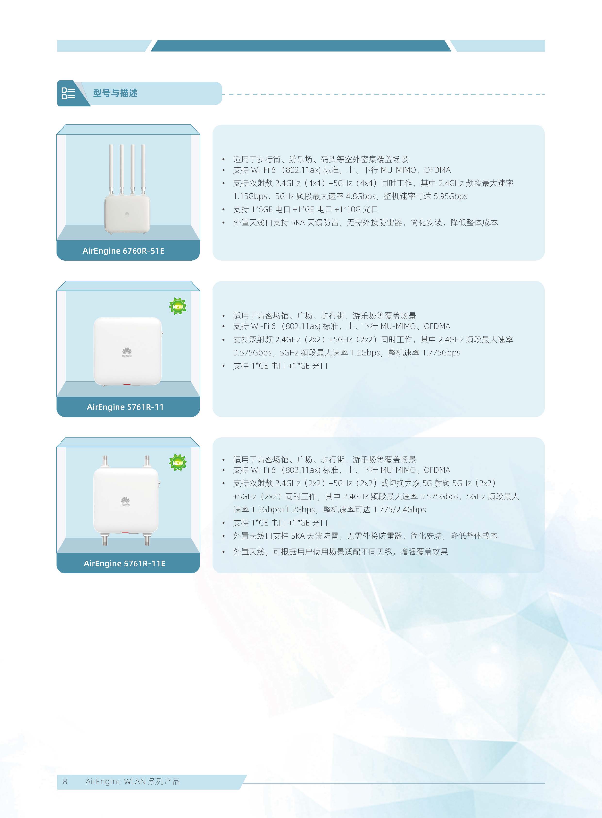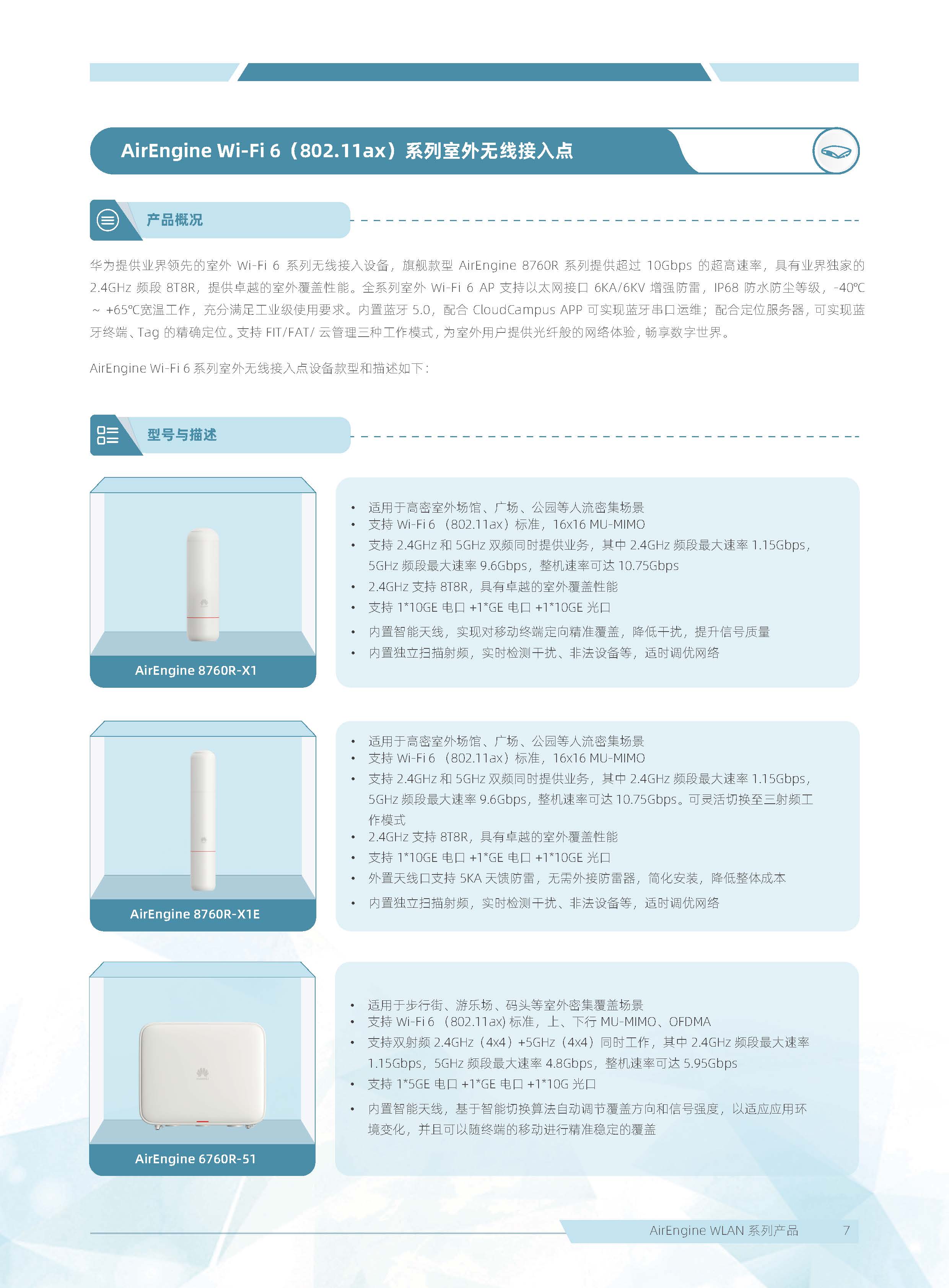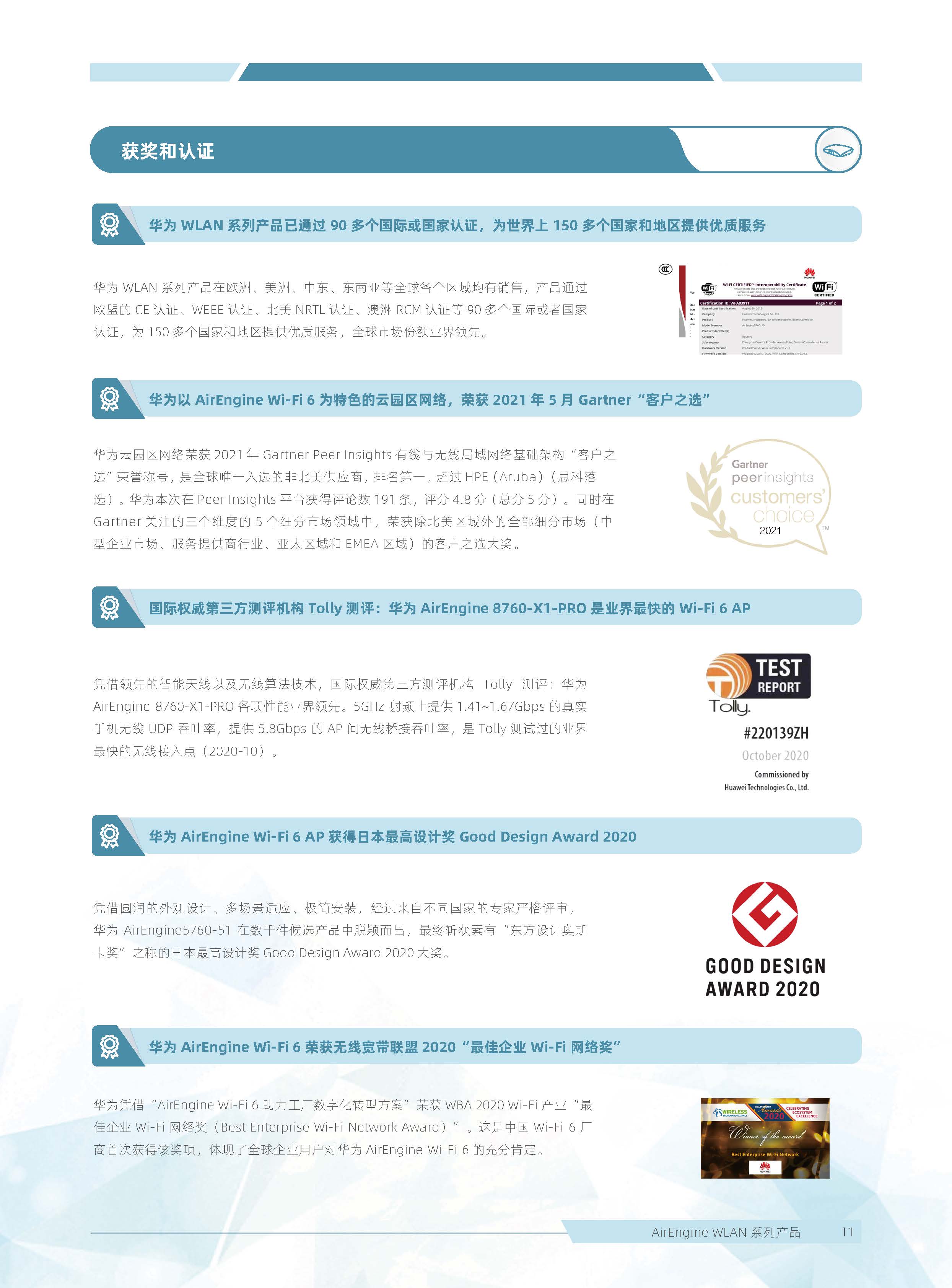 華為 AirEngine Wi-Fi 6 系列無線局域網產品,構建在 Wi-Fi 6 標準之上,在天線技術、基帶技術、射頻算法等方面做了顯著創新,全系列新一代室內放裝 AP 具有業界領先的智能天線、二 / 三射頻靈活可切、獨立射頻掃描、內置藍牙 5.0,內置雙 IoT 模塊卡槽、光電混合傳輸接口等領先技術,為企業客戶打造極速性能、穩定體驗、隨時隨地 100Mbps 的全無線園區網絡