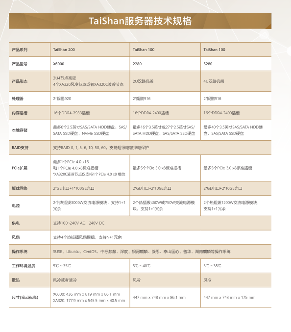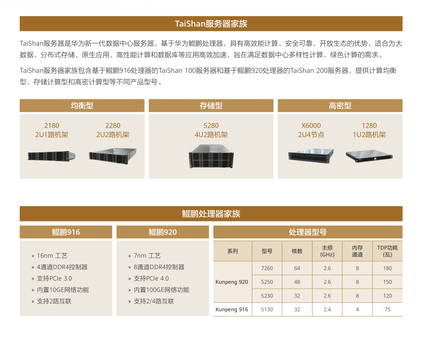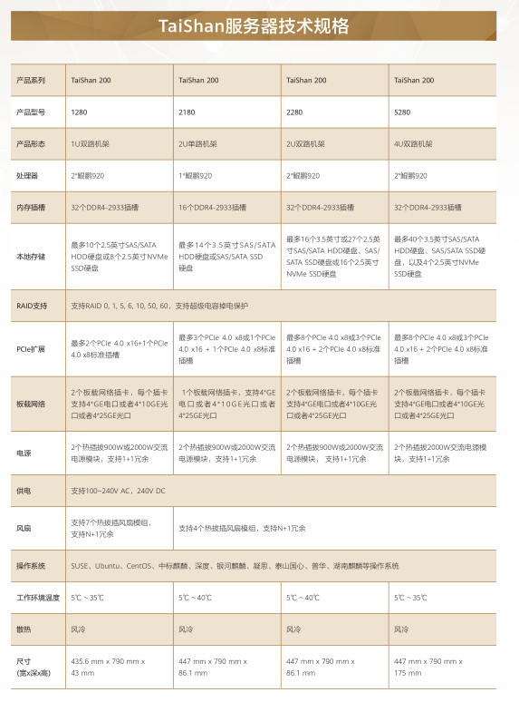 TaiShan 200服務器,基于鯤鵬920處理器,包含2280E邊緣型、1280高密型、2280均衡型、2480高性能型、5280存儲型和X6000高密型等產品型號。TaiShan 100服務器,基于鯤鵬916處理器,包含2280均衡型和5280存儲型等產品型號。